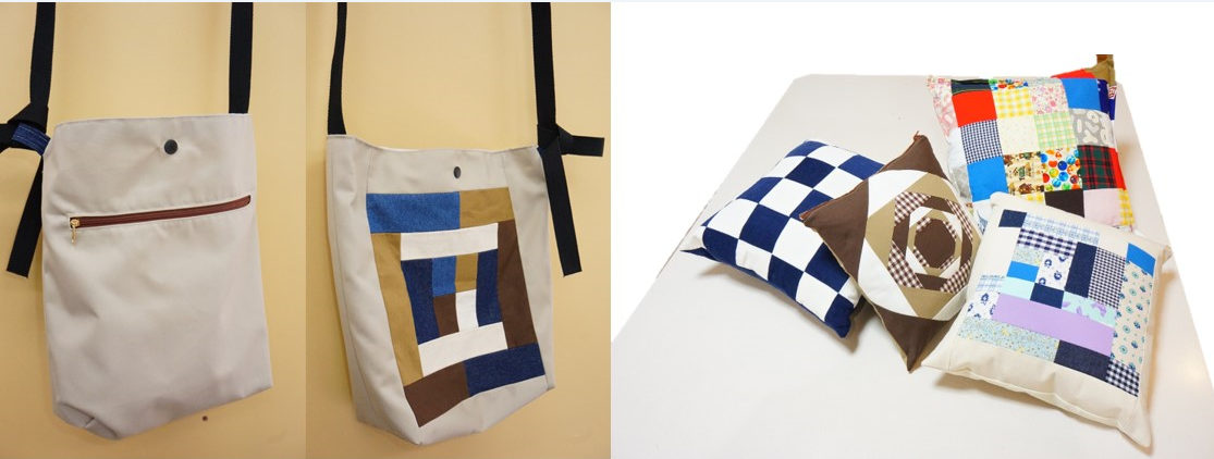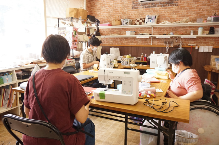 ご寄付いただいた未使用の布を布製品として生まれ変わらせる、SDGs的で素敵なお仕事をしております。木工品はキンモクセイやモクレンの枝から作っており、「誰かに切ってほしい」というニーズにマッチしたお仕事をいただいて地域に貢献しております。