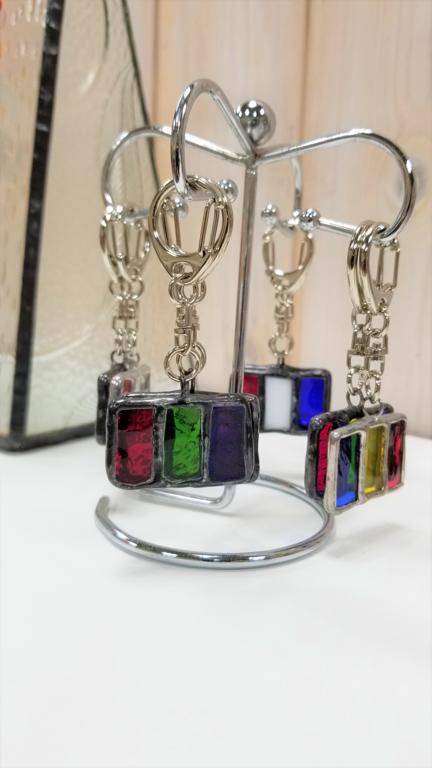 国旗のようなキーホルダーです。三色のステンドグラスが綺麗です