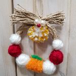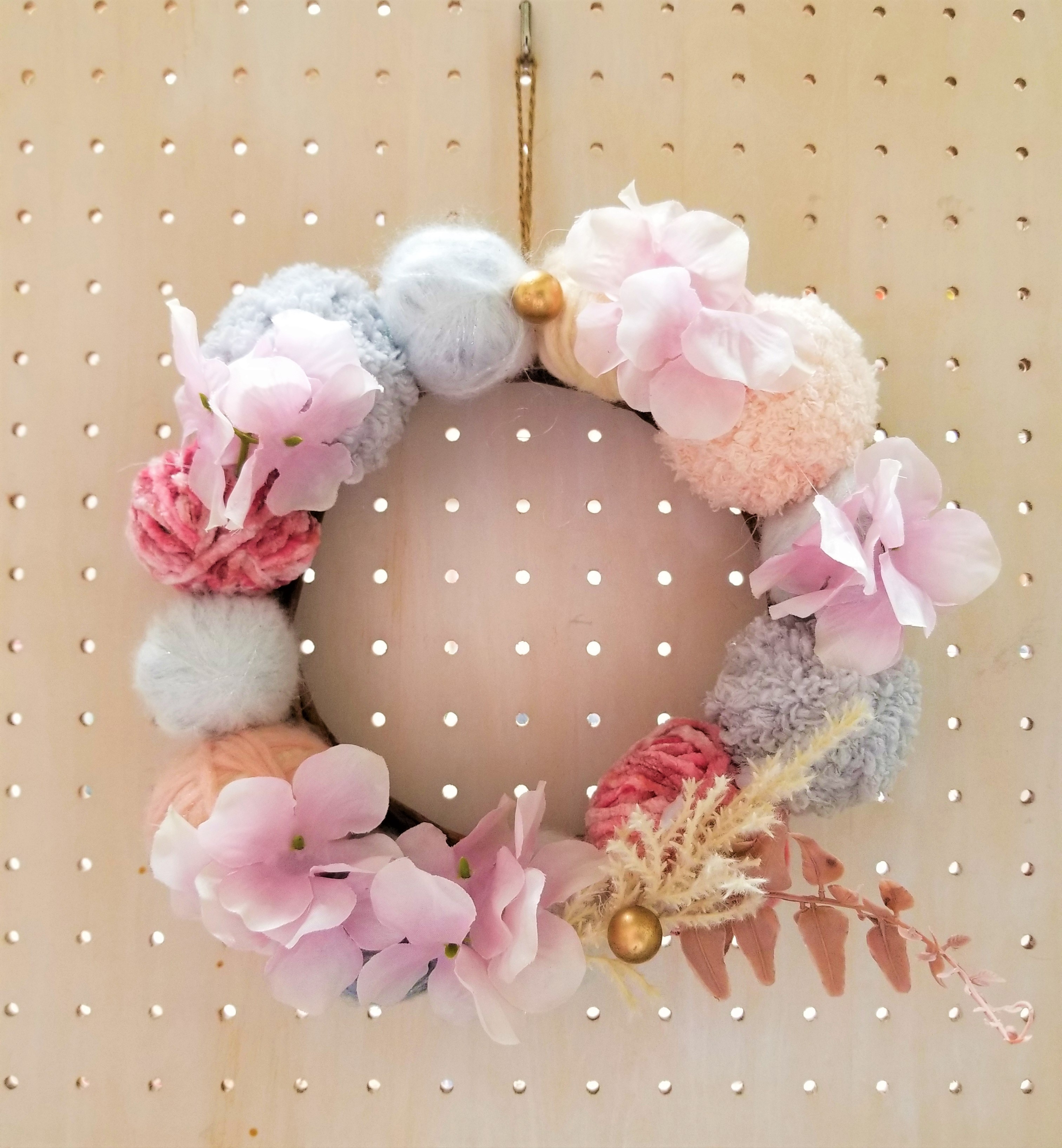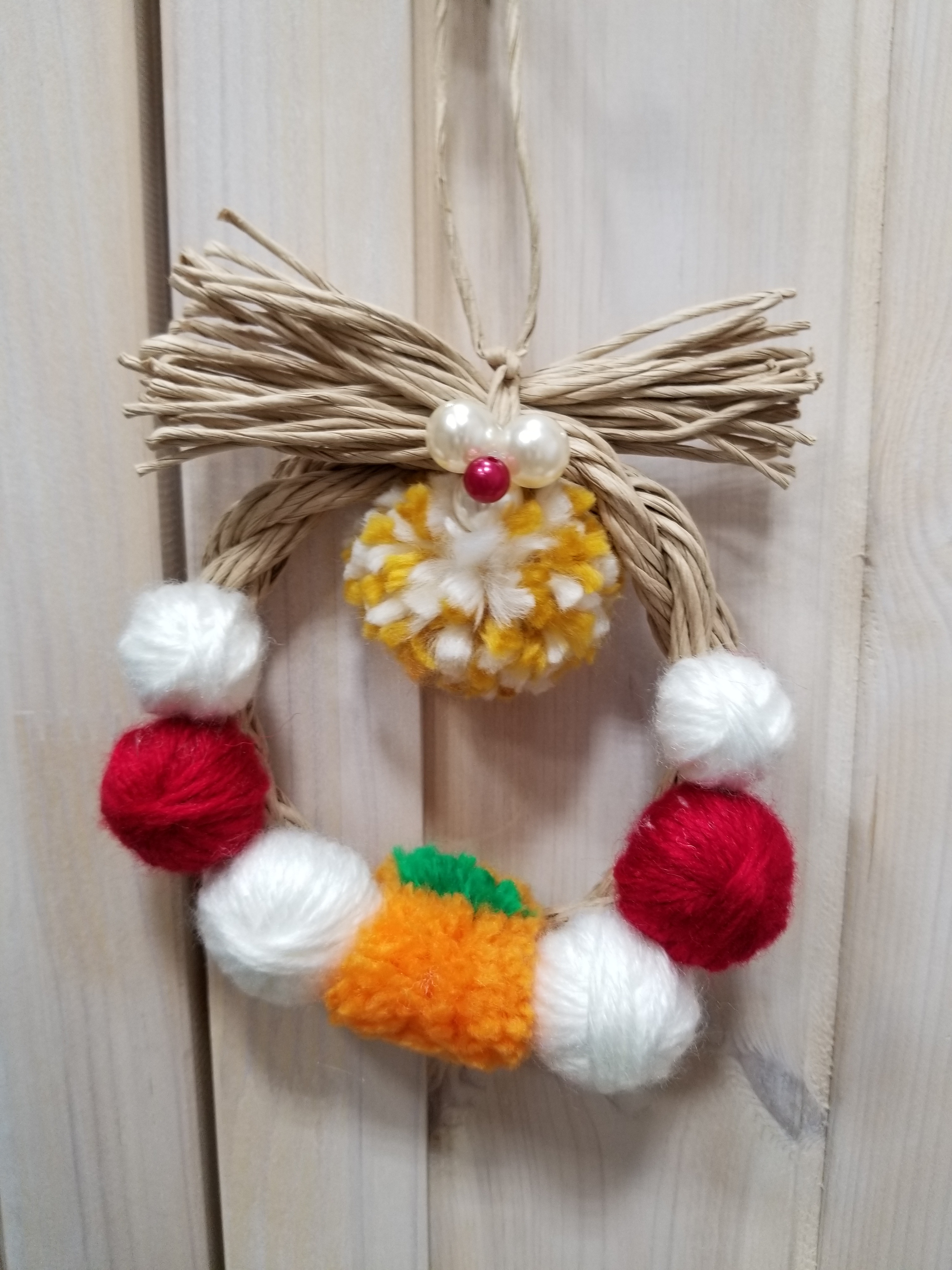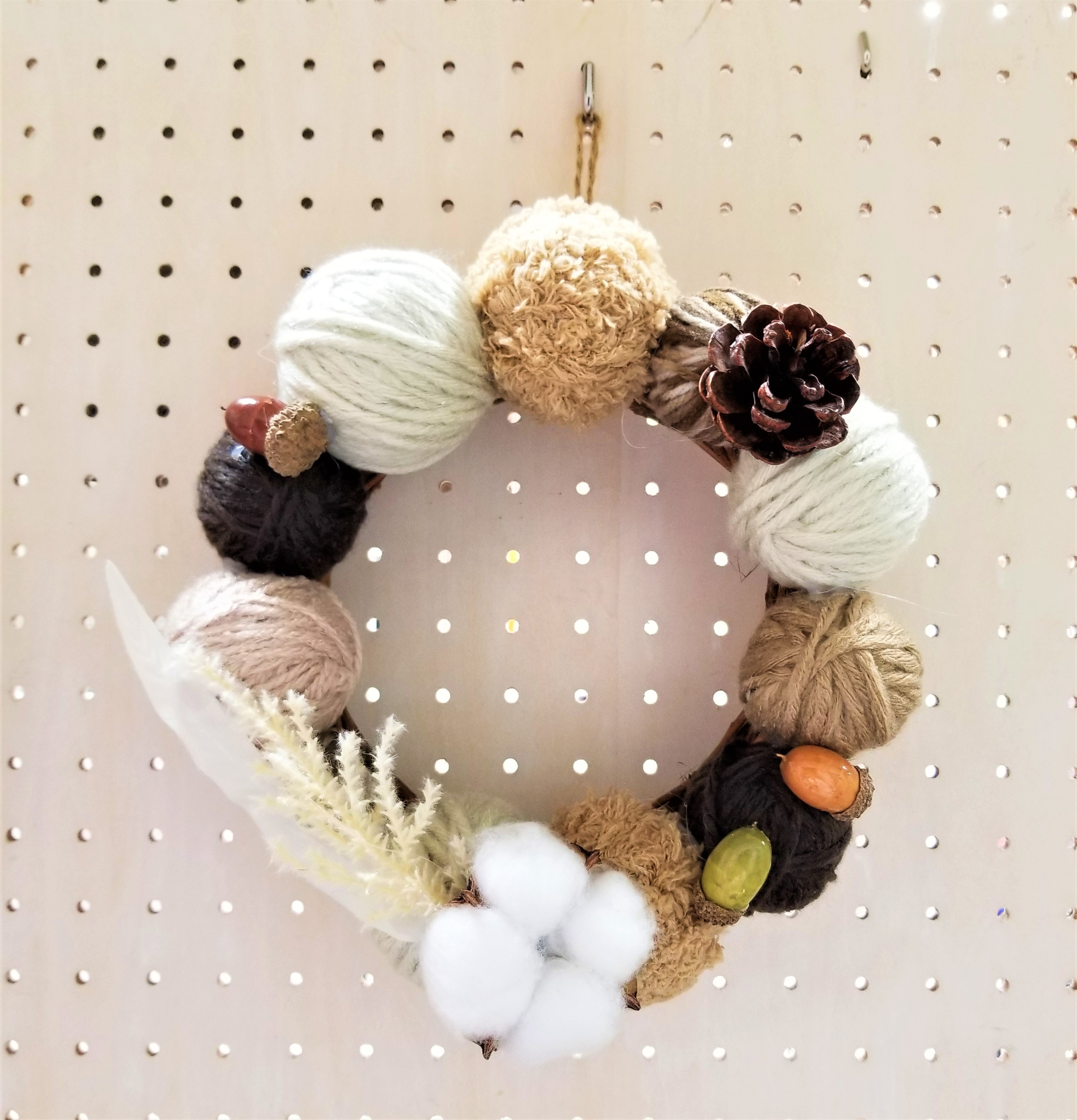 毛糸玉を使ってリースを作りました。やさしい色合いです。