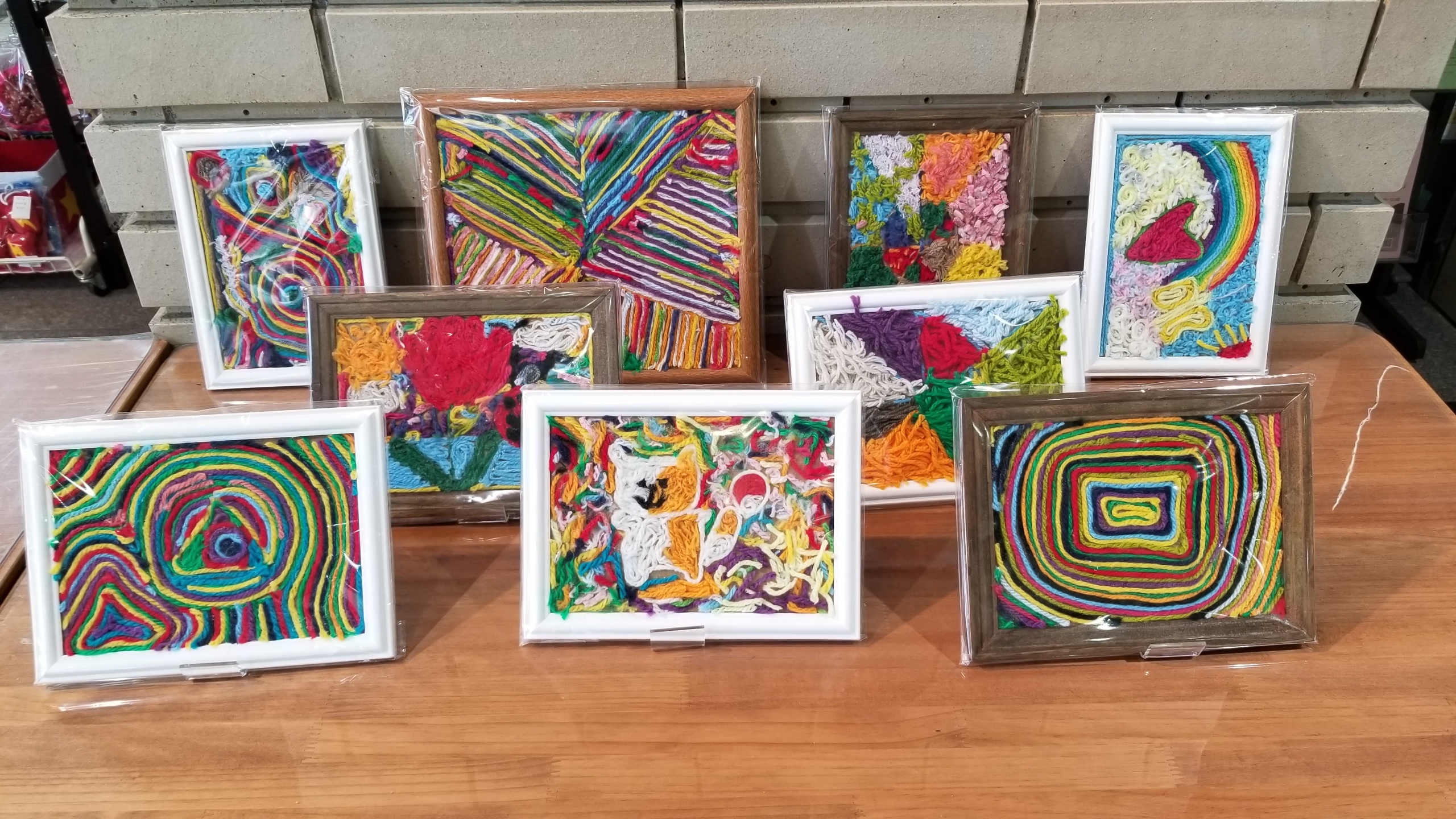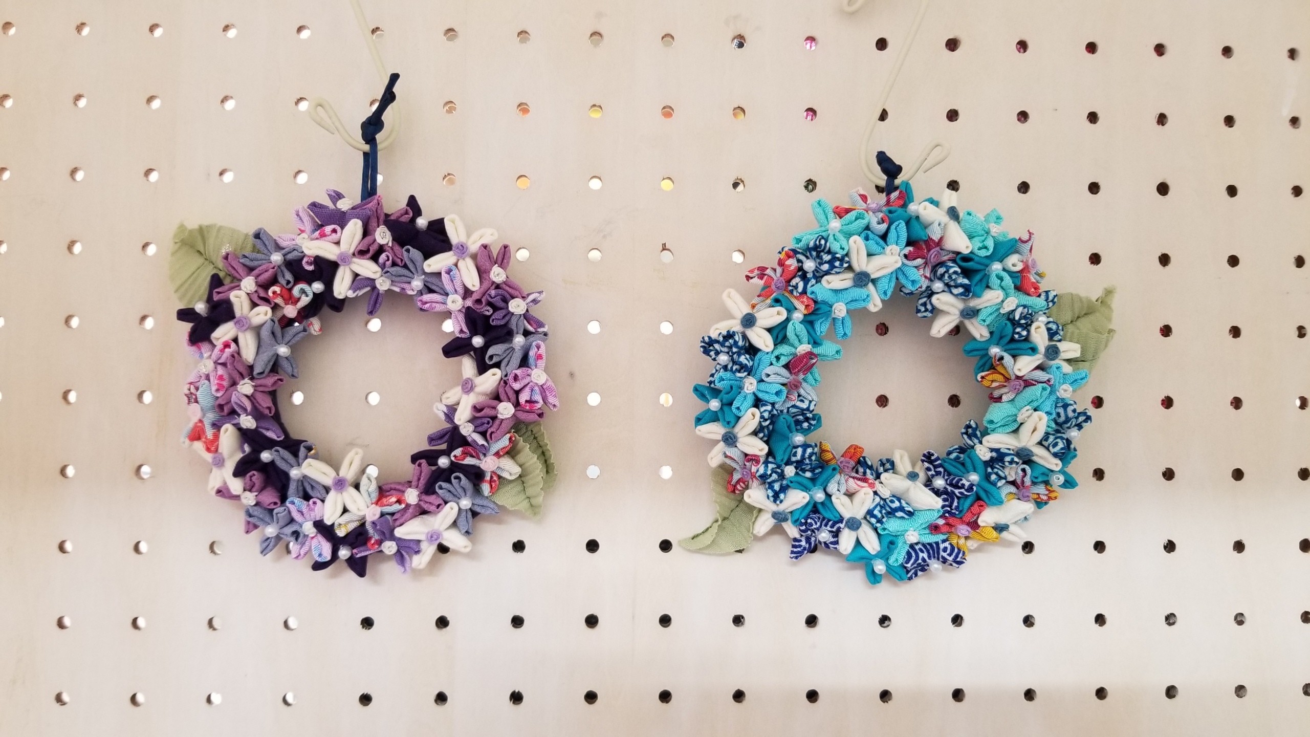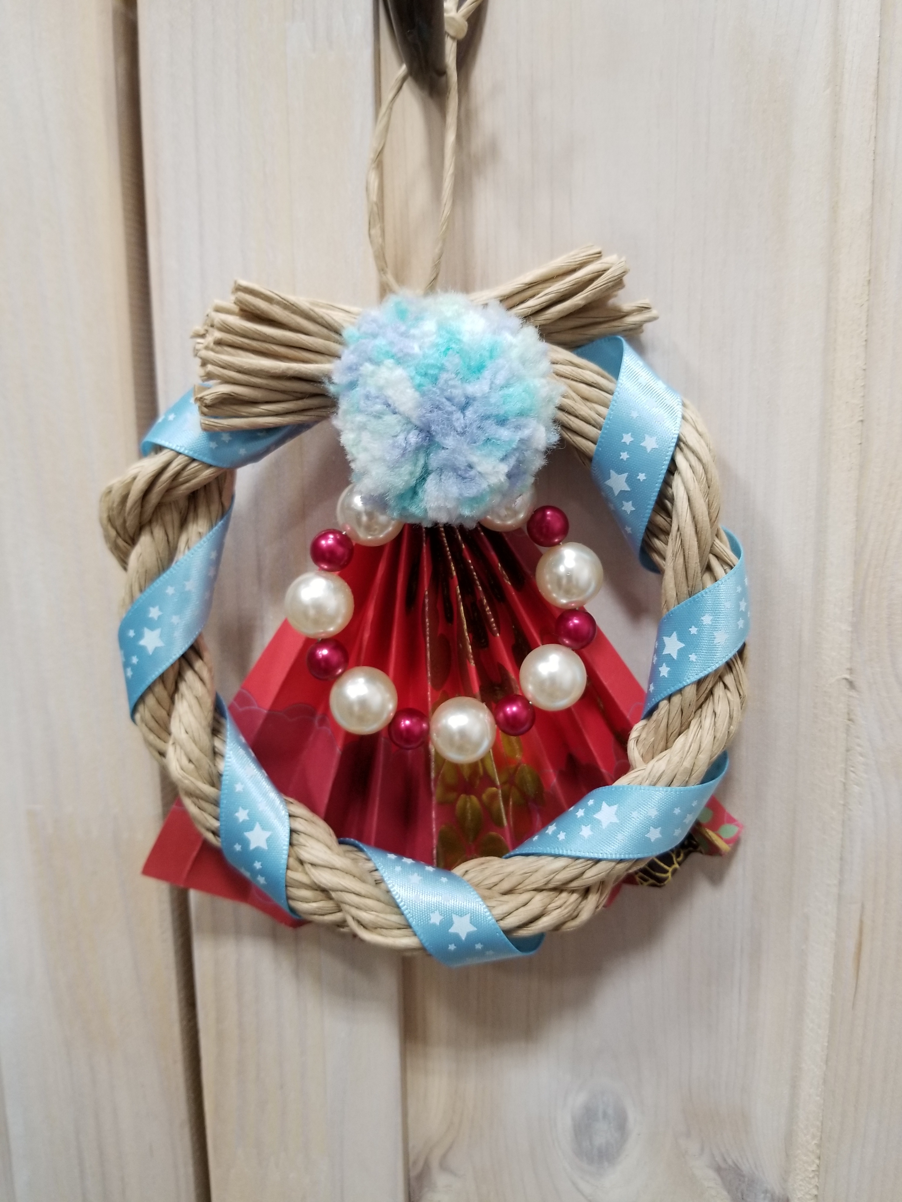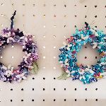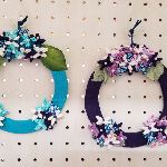 毛糸玉を使ってリースを作りました。やさしい色合いです。