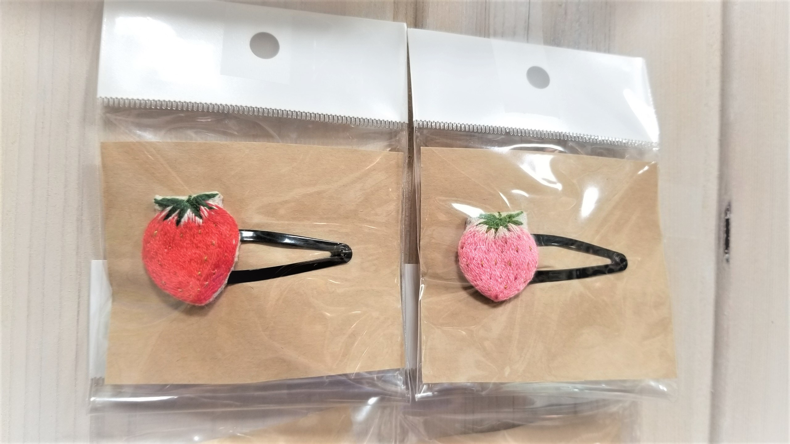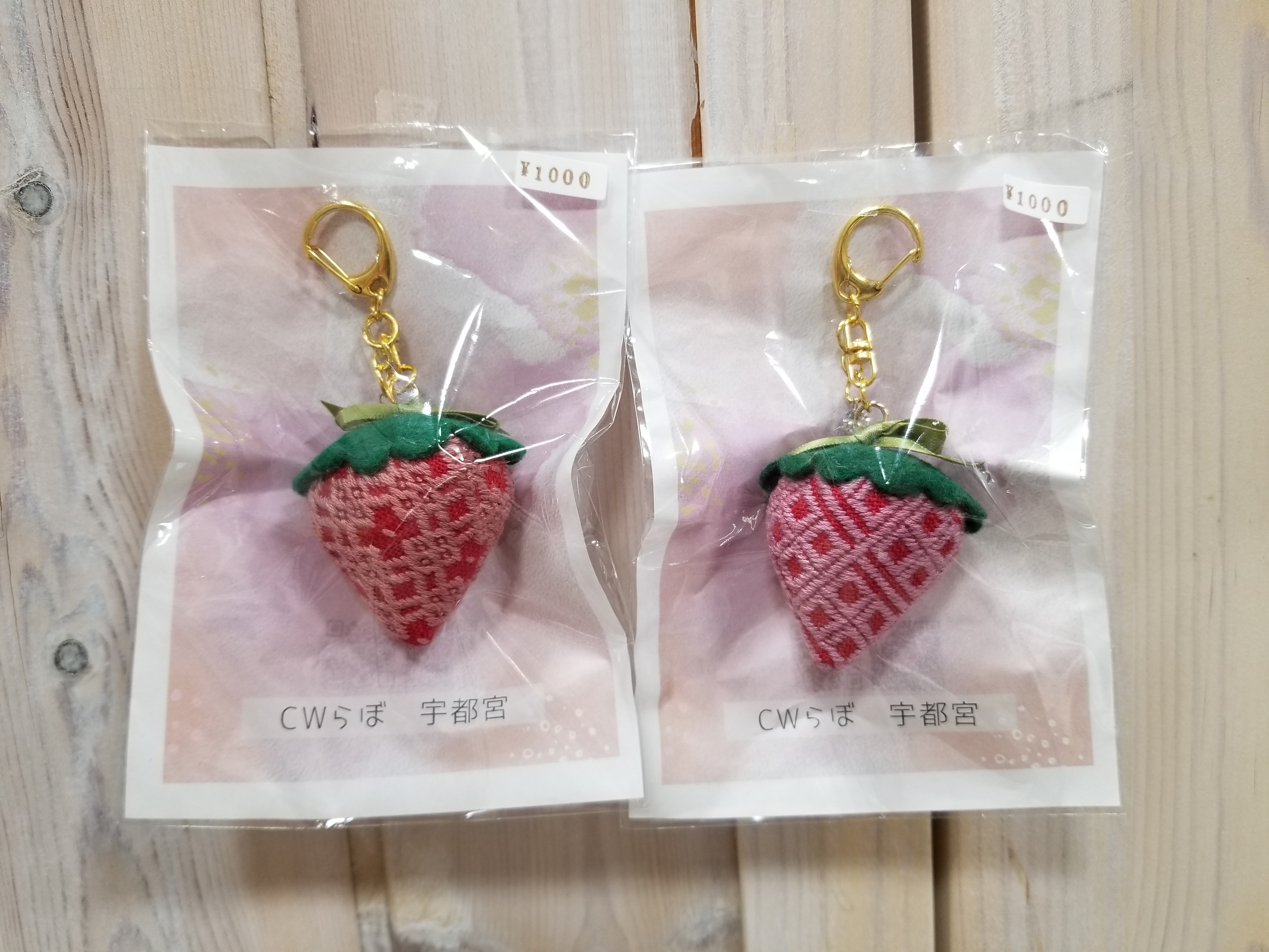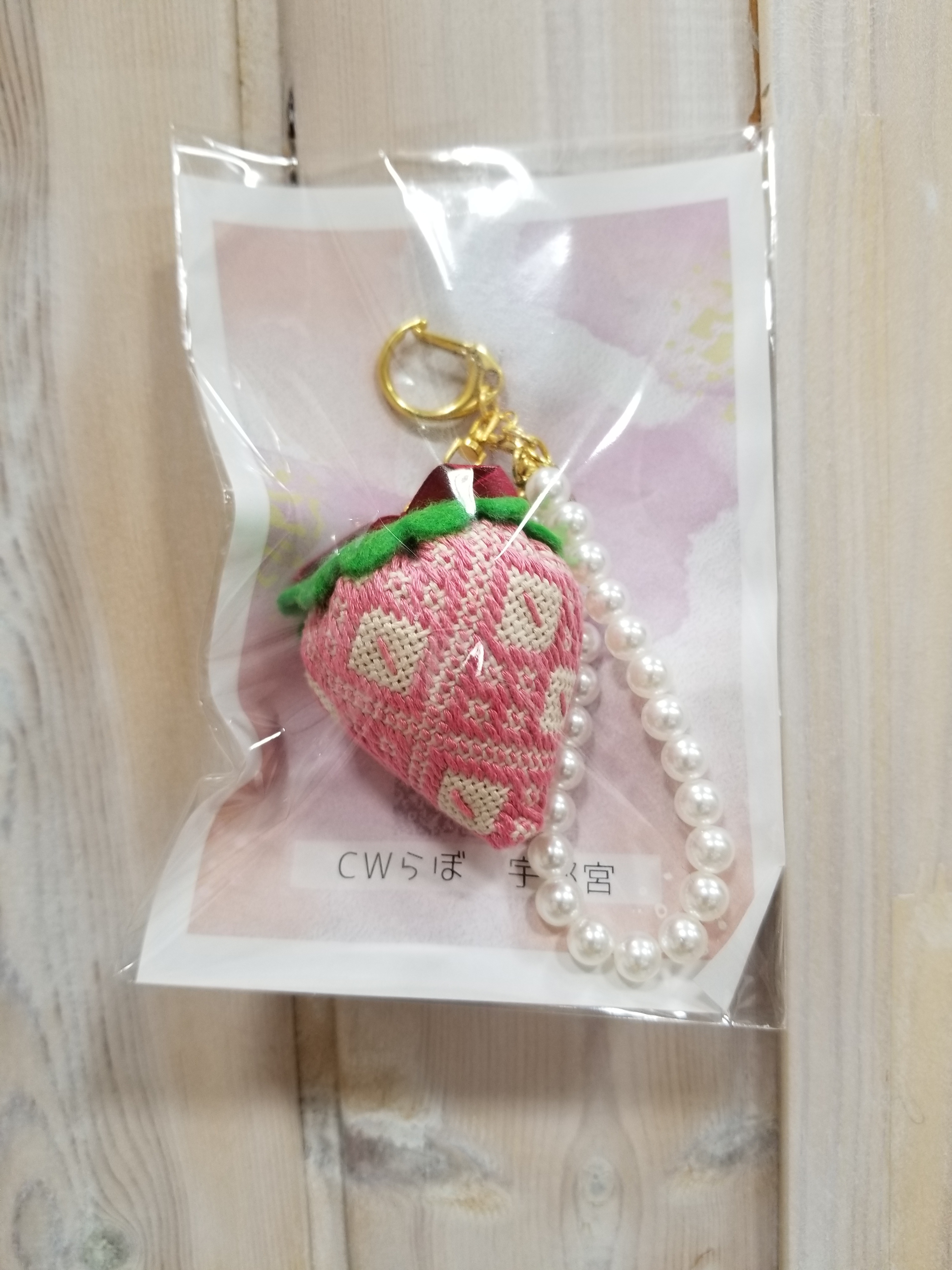 こぎん刺しで苺を表しました。パールのチャーム付きもかわいいですよ