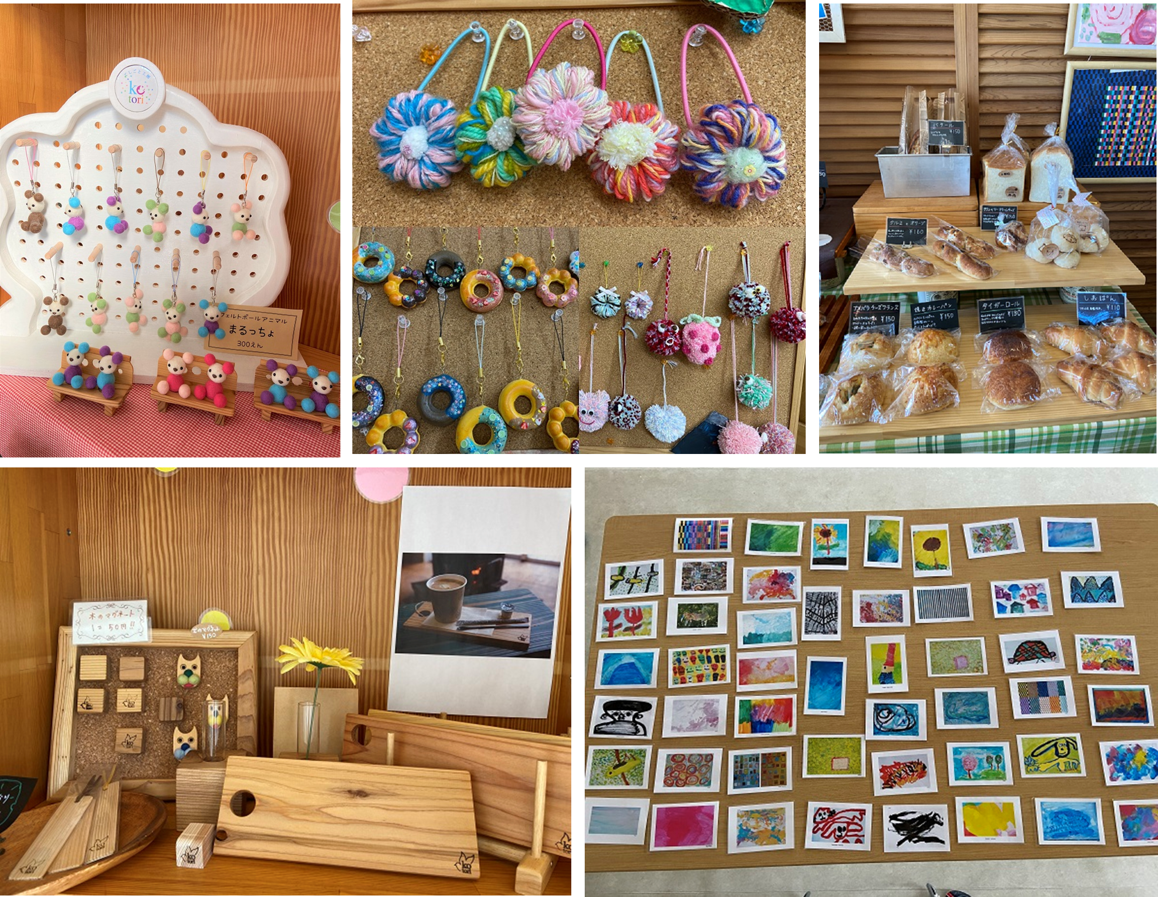 ひばりの就労Bでは天然酵母を使用した手作りのパンや、フェルトを使ったアクセサリーやストラップ。マグネットやコースター、フォトフレームなどの木工製品。 生活介護では毛糸を使ったヘアゴムやレジン風のストラップ、ハニワを模ったマグネット、陶芸作品、利用者さんが描いた絵のポストカードなどの作成など、様々な商品を作成しています。